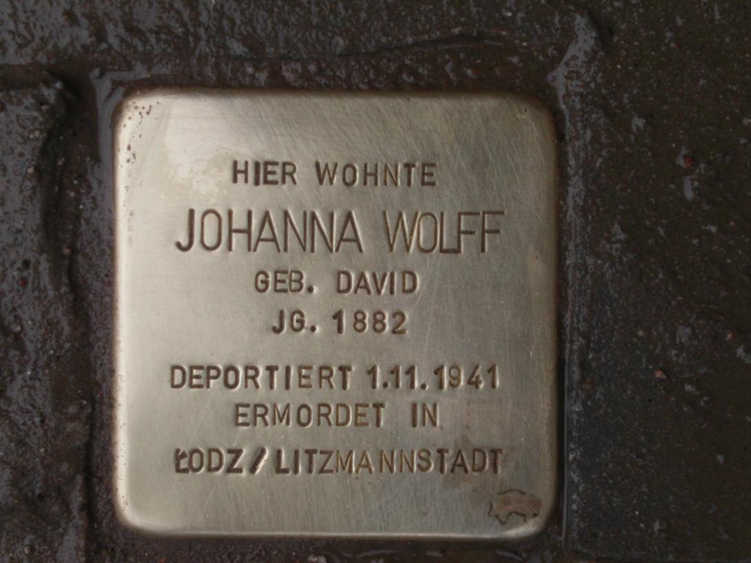 Kaum war er – am 30. Oktober – in Lodz eingetroffen, wurde am 1. November 1941 seine Frau Johanna Wolff, am 21. September 1882 unter dem Namen David in Stralkau in der Nähe von Posen geboren, mit dem nächsten Zug (1033 Insassen) ebenfalls vom Gleis 17 des Bahnhofs Grunewald nach Lodz/Litzmannstadt deportiert. Auch sie kam dort ums Leben, das Todesdatum ist unbekannt. Ob die Eheleute, die zwei Söhne hatten, sich im Ghetto noch einmal wiedergesehen haben, ist nicht übermittelt.