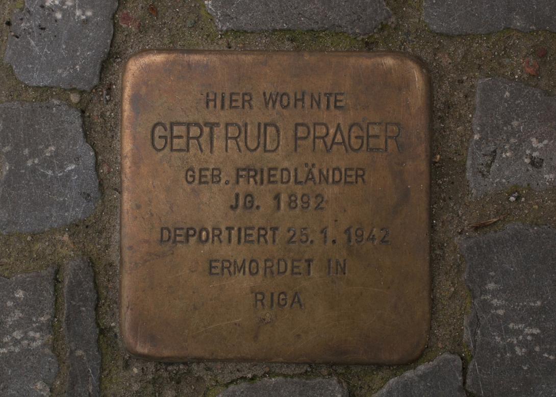 Gertrud Prager, geborene Friedländer, ist am 12. Dezember 1892 in Schulitz (Solec) im Bezirk Posen (Poznan) geboren. Sie war die zweite Frau des sozialdemokratischen Journalisten Eugen Prager, den sie 1915 in Leipzig heiratete, wo er leitend bei der „Leipziger Volkszeitung“ tätig war. Sie hatten drei Kinder: Ruth, Irene und Michael, denen sie 1934/45 zur Flucht nach Palästina verhalfen. Obwohl sie sich darum bemühten, auch die Eltern zu bewegen, ihnen zu folgen, misslang der Plan – einerseits am Willen des Vaters, „konsequent“ in Deutschland durchzuhalten, andererseits an fehlenden Auswanderungspapieren. In Not geraten, musste das Ehepaar Prager in eine kleinere Wohnung umziehen. Von dort wurden beide am 25. Januar 1942 bei klirrender Kälte auf dem Bahnhof Grunewald in einen Güterzug getrieben, der am 30. Januar in Riga ankam. Die meisten von denen, die nach dieser fünftägigen Qual noch nicht erfroren waren, sind sogleich erschossen worden.