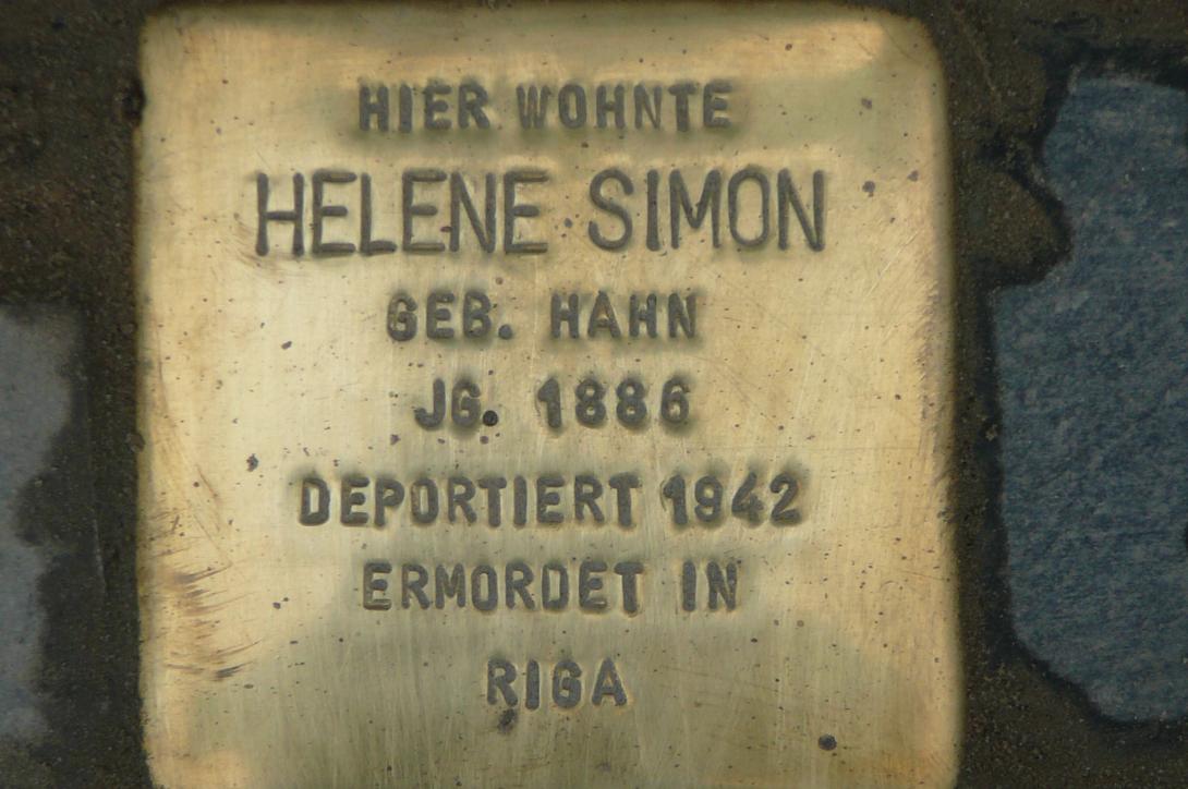 Helene Simon, geb. Hahn, am 24. September 1886 in Berlin, war mit Walter Sally Simon, geb. am 17. Oktober 1882 ebenfalls in Berlin, verheiratet.
