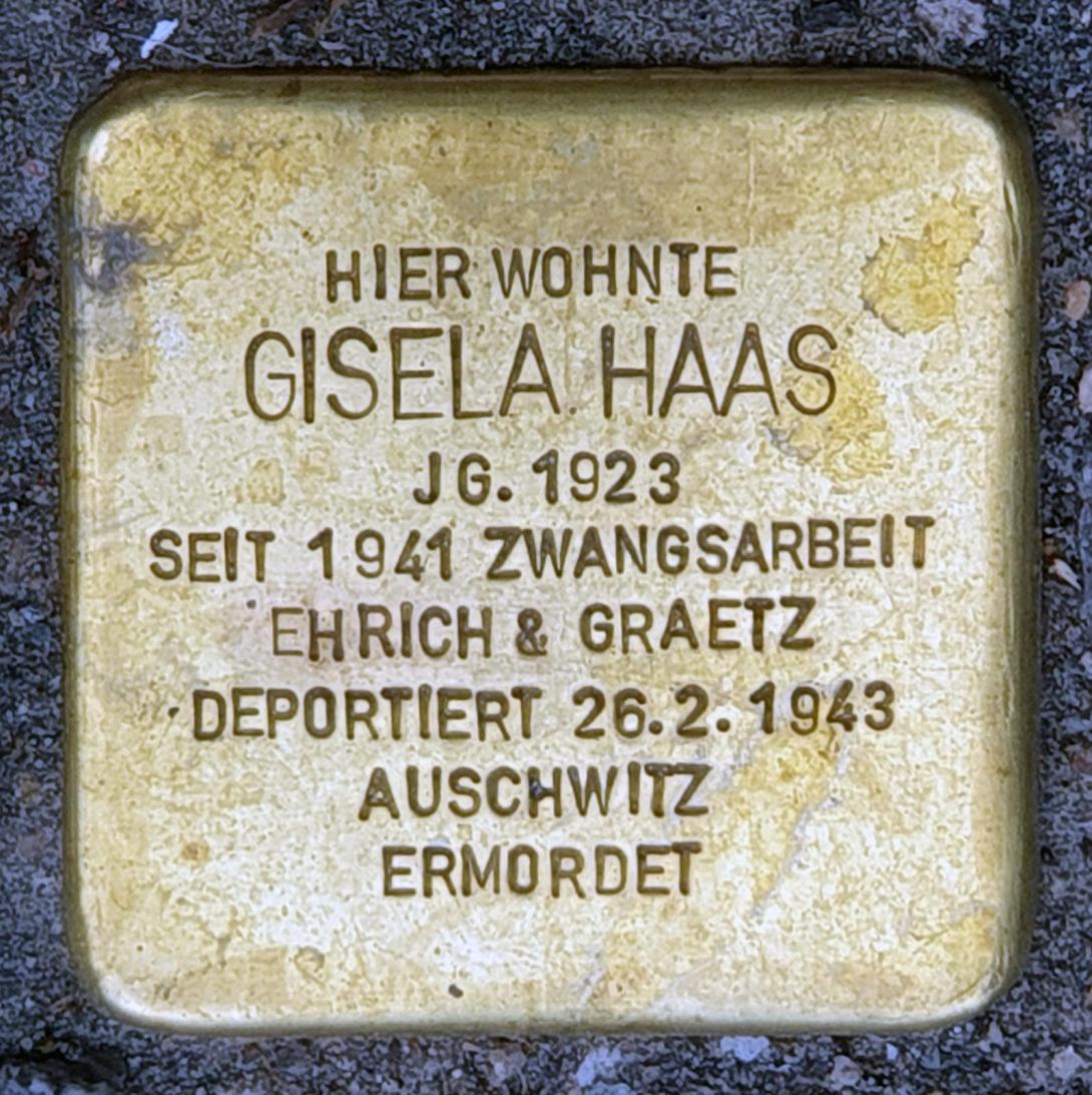 Gisela Haas wurde am 4. Oktober 1923 in Berlin geboren und wohnte mit ihrer Familie in der Melchiorstraße 28 in Berlin, bis die Familie um 1930 in die Kirchstraße 2, Berlin Tiergarten umzog.