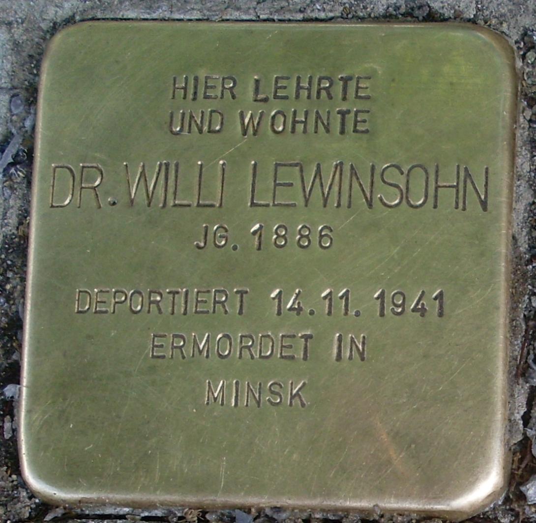 Dr. Willi Lewinsohn wurde am 30. August 1886 in Thorn (heute Toruń) geboren. Er war ab 1919 Gymnasiallehrer im Berlinischen Gymnasium zum Grauen Kloster. Er wohnte mit seiner Frau, Grete Lewinsohn, geb. Schönberger, und seinen beiden Söhnen, Karl-Philipp und Helmut-Wolfgang bis 1933 im Direktorenwohnhaus in der Klosterstraße 73. Nach 1933 musste er die Wohnung verlassen und wurde kurze Zeit später aufgrund der rassistischen Gesetzgebung der Nationalsozialisten aus dem Schuldienst entlassen. Aufgrund des Hindenburg-Erlasses konnte der Weltkriegsteilnehmer noch einmal an seiner alten Wirkungsstätte als Lehrer tätig werden und bis 1935 im Gymnasium unterrichten. Am 14. November 1941 wurde Dr. Willi Lewinsohn mit seiner Frau und seinem Sohn Helmuth-Wolfgang mit dem „V. Transport“ nach Minsk deportiert und ermordet. Sein Sohn Karl-Philipp hatte 1939 den Versuch unternommen, sich vor der nationalsozialistischen Verfolgung durch Flucht zu retten. Er wollte über die Donau nach Palästina. Im Balkan wurde er gestoppt und nach Inhaftierung in Dachau 1942 in der