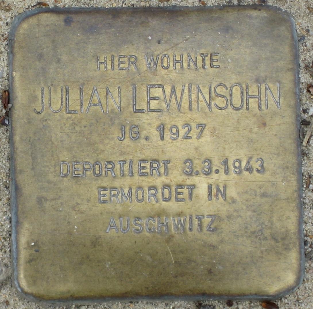 Seit 1933 ging Julian Lewinsohn in die 9. Volksschule. Am 24. November 1938 erfolgte der Wechsel in die 14. Volksschule. Die Schulpflicht endete für Julian am 28. März 1941. Im Anschluss musste er Zwangsarbeit bei der Deutschen Waffen- und Munitionsfabrik AG Borsigwalde leisten. Im Rahmen der sogenannten „Fabrik-Aktion“ wurden seine Eltern Hugo und Else Lewinsohn gemeinsam mit seinen Geschwistern Artur, Rita und Retha Lewinsohn mit dem „33. Osttransport“ am 3. März 1943 nach Auschwitz deportiert, wo die Familie ermordet wurde. Seine jüngere Schwester Retha, geboren am 23. Dezember 1942, war zum Zeitpunkt ihrer Deportation und Ermordung erst wenige Monate alt. Julian Lewinsohn wurde einen Tag vor seinen Eltern und Geschwistern, am 2. März 1943, vom Sammellager in der Levetzowstraße aus mit dem „32. Osttransport“ nach Auschwitz deportiert, wo der 16-Jährige am 18. April 1943 ermordet wurde.