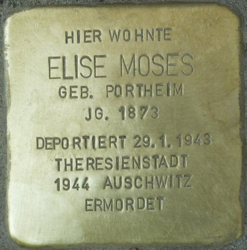 Elise Moses wurde am 29. Januar 1943 mit ihrem Ehemann nach Theresienstadt deportiert. Richard Moses starb am 11. Januar 1944 in Theresienstadt. Elise Moses wurde am 16. Mai 1944 von Theresienstadt nach Auschwitz verschleppt und dort ermordet.