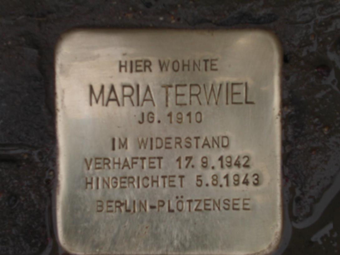 Maria Terwiel, die katholisch war, und der evangelische Christ Helmut Himpel gehörten zum Widerstandkreis „Rote Kapelle“, zu dessen Mitgliedern sie Kontakte hatten. Sie vervielfältige 1941 die Predigten des Münsteraner Bischofs Clemens August von Galen (1878-1946) gegen die als „