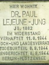 Seit 1992 erinnert in Berlin in der Nähe des Reichstags eine der 96 Gedenktafeln für von den Nationalsozialisten ermordete Reichstagsabgeordnete an Paul Lejeune-Jung.