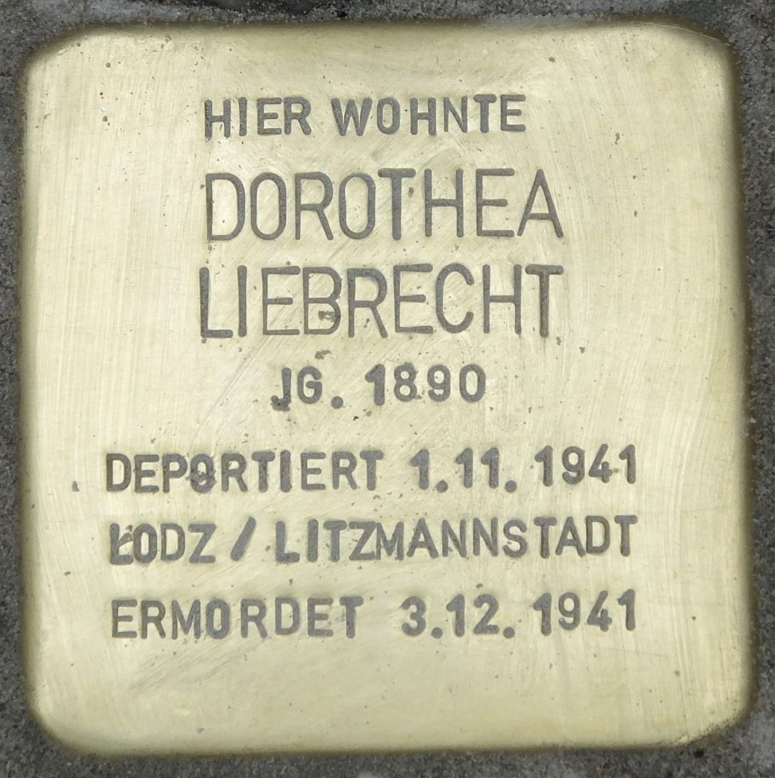 Dorothea Liebrecht, geboren am 29. Mai 1890 in Berlin, lebte mit ihrer Schwester Elly Lachmann, geb Liebrecht, die am 16. April 1883 in Berlin geboren wurde und deren Ehemann Julius Lachmann, Versicherungsvertreter, in der Mainzer Straße 15 in Berlin Wilmersdorf. Alle drei wurden am 1. November 1941 nach Lodz/Litzmannstadt deportiert. Julius Lachmann wurde am 16. September 1942 dort ermordet. Seine Frau Elly wurde am 4. Mai 1942 in das