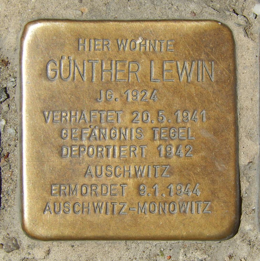 Günther Lewin wurde am 20. Mai 1941 durch Polizisten festgenommen. Er trug keinen gelben Stern und benutzte ein Fahrrad, das angeblich nicht ihm gehörte. Nach einem Aufenthalt in der Berliner Gestapozentrale am Alexanderplatz kam er bis zum 25. Mai 1941 in Untersuchungshaft, später in Haft in das Strafgefängnis Berlin-Tegel. Das bei der Verhaftung beschlagnahmte Fahrrad erhielt die Mutter als „Arierin“ zurück, da sie nachweisen konnte, dass es tatsächlich ihrem Sohn gehörte. Mit einem Häftlingssammeltransport wurde Günther Lewin am 19. März 1943 nach Auschwitz deportiert, wo er die Häftlingsnummer 109286 erhielt. Vom 13. Dezember 1943 an wurde er bis Januar 1944 mehrfach in Häftlingskrankenbau von Auschwitz-Monowitz behandelt. In Auschwitz traf er einmal auf seinen ebenfalls dorthin deportierten Bruder Bernhard. Am 8. Januar 1944 starb Günther Lewin im Häftlingskrankenbau von Auschwitz. Sein 1944 aus Auschwitz nach Groß-Rosen und 1945 nach Buchenwald verbrachter Bruder Bernhard starb am 25. Januar 1945 in Flößberg nahe Leipzig, einem Außenlager von Buchenwald. Er wurde Opfer schwerer Misshandlungen. Sein Bruder Horst starb am 23. Januar 1945 im Außenlager Kaufring des Konzentrationslagers Dachau. Günther Lewins Vater Arthur Lewin überlebte. Bereits von Juni 1938 an Häftling in den Lager Buchenwald, Sachsenhausen, Mauthausen und Ebensee, konnte sich der Schriftsetzer und Buchdrucker ab August 1942 als Typograf in der sogenannten Fälscherwerkstatt und Blockältester im Konzentrationslager Sachsenhausen eine Position innerhalb der Häftlingshierarchie schaffen, die ihm das Überleben sicherte.