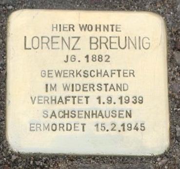 Anders als die Mehrzahl der Stolpersteine, die ermordeten jüdischen Mitbürgern gewidmet sind, erinnert dieser Stolperstein am Miltenberger Weg 9 an den Sozialisten, Gewerkschafter und Reichtagsabgeordneten Lorenz Breunig, der hier mit seiner Familie den letzten Wohnsitz vor seiner Ermordung im Jahre 1945 hatte.