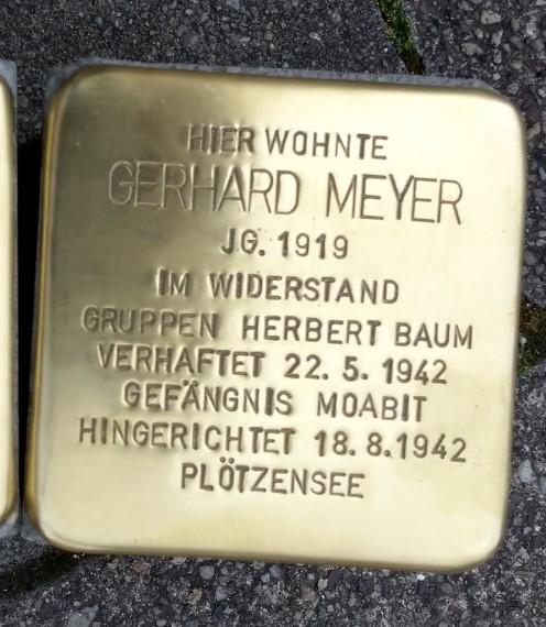 Am 18. Mai 1942 verübte die Gruppe um Herbert Baum einen Brandanschlag auf die antisowjetische Propaganda- Ausstellung „Das Sowjetparadies“ im Berliner Lustgarten. Gerhard Meyer nahm an der Aktion selbst teil, bei der mit wenig Erfolg in einem der Ausstellungsräume eine Brandbombe gezündet wurde, die außer einer starken Rauchentwicklung kaum Schaden anrichtete. Unmittelbar nach dem Anschlag fing eine engmaschig geführte Repressionswelle an. Einige aus der Herbert-Baum-Gruppe tauchten unter. Auch Gerhard und Hanni Meyer benutzten falsche Papiere und verließen das Haus in der Georgenkirchstraße. Sie mieteten sich ein Sommerhäuschen in Petershagen, doch wurde Gerhard schon am 22. Mai 1942 mit anderen zusammen verhaftet. Kurz darauf, am 3. Juni 1942 wurde auch Hanni Meyer verhaftet. Es wird angenommen, dass ein Informant in einer an der Aktion beteiligten, nicht-jüdischen Widerstandsgruppe Mitglieder der Herbert-Baum-Gruppe verriet, um seine eigene Familie zu retten. Am 16. Juli 1942 wurde Gerhard wegen Hochverrat der Prozess gemacht und das Todesurteil verhängt. Er wurde am 18. August 1942 in Plötzensee hingerichtet. Seine Frau Hanni erlitt im folgenden Jahr das gleiche Schicksal, auch sein Bruder Herbert wurde verhaftet und starb vermutlich an den Folgen von Folter noch in der Untersuchungshaft in Moabit.
