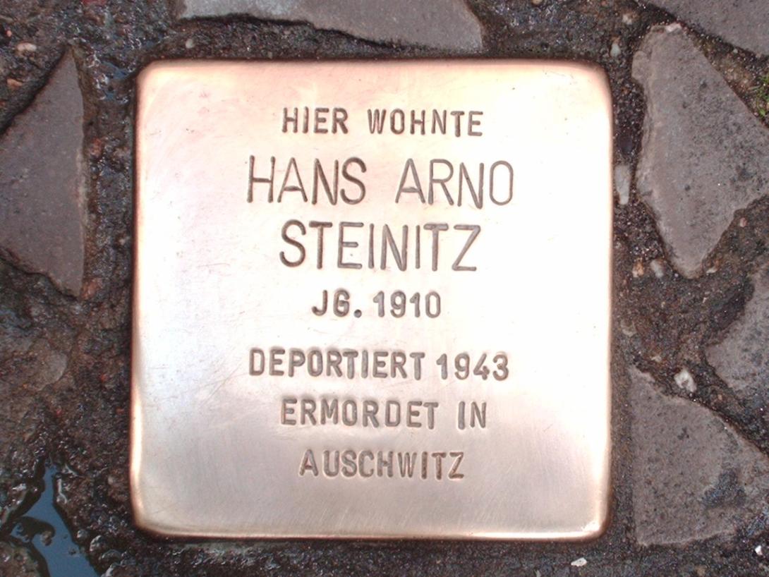 Aktenkundig wird Hans Arno Steinitz erst 1939, als er bei der Volksabstimmung vom 17. Mai in der Ergänzungskartei für Juden erfasst wurde. Er wohnte in der Mommsenstraße 34, sein Vermieter, sowie seine Ausbildung werden im Gedenkbuch des Bundesarchivs nicht genannt. Möglicherweise war Hans Arno sehbehindert, denn ab 1941 arbeitete er als Bürstenmacher in der Blindenwerkstatt Otto Weidt, wodurch ihm anderweitige Zwangsarbeit erspart wurde.