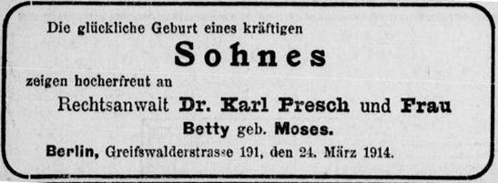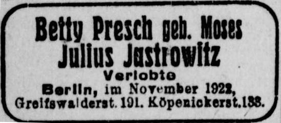 Betty Moses wurde in Gartz a.d. Oder (damals Pommern, heute Brandenburg) am 8. September 1883 geboren. Ihr Vater war der Kaufmann Moses Moses und die Mutter Ernestine, geb. Traube. Betty hatte einen zwei Jahre jüngeren Bruder, Georg. Die Eltern waren wohlhabend, führten ein Textilgeschäft und besaßen mehrere Häuser und Grundstücke in Gartz. 1907 heiratete Betty den am 27. Januar 1881 in Schwiebus geborenen Karl Presch, von Beruf Rechtsanwalt. Das Paar ließ sich in Berlin in der Greifswalder Straße 191 nieder. Dort richtete Karl auch seine Kanzlei ein. Am 11. April 1912 brachte Betty ihre Tochter Ilse zur Welt, zwei Jahre später, am 23. März 1914 den Sohn Manfred. Wenige Jahre danach wurde Karl Presch Opfer der Grippewelle, als er bei einem Feld-Militärgericht tätig war. Er starb 37-jährig am 1. Oktober 1918 und wurde in Weißensee bestattet. „Er war mein ganzes Glück, mein Sonnenschein“ ließ Betty in die Traueranzeige schreiben. Zuletzt war Karl Presch Rechtsanwalt beim Landgericht gewesen, seine Kanzlei war am Alexanderplatz in der Landsberger Straße 66/67. Betty blieb mit den Kindern in der geräumigen Wohnung in der Greifswalder Straße 191 wohnen. Im November 1923 verlobte sie sich mit Julius Jastrowitz, am19. Dezember 1923 heiratete sie ihn.