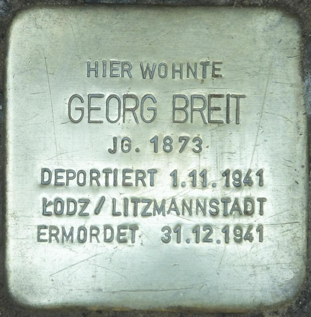 Georg Breit wurde am 1. November 1941 in das Ghetto von Lodz, damals: Litzmannstadt, deportiert. Zuvor hatte er Zwangsarbeit in Berlin leisten müssen. In Litzmannstadt wurde er am 31. Dezember des gleichen Jahres ermordet. Er wurde 68 Jahre alt. Angesichts der drohenden Deportierung nahm sich Franz Oscar Breit, der Bruder von Georg Breit, am 2. Februar 1942 das Leben. An ihn erinnert ein Stolperstein in der Dernburgstraße 55, siehe http://www.berlin.de/ba-charlotten….