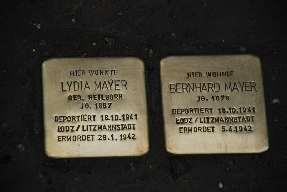 Lydia Mayer, ihr Mann Bernhard sowie die in der Münchener Straße 16 ebenfalls lebenden Nachbarn Max Mark (s. dort) und Rosa Scheffler (s. dort) wurden am 18. Oktober 1941 mit dem 1. Transport nach Litzmannstadt verfrachtet. Dort wohnten sie ab dem 26. Oktober 1941 in der 28. Straße Nr. 33 (Bleicherweg) in Wohnung 5. Die Wohnung, die er und seine Frau sich mit weiteren 9 Menschen teilten, bestand aus zwei Zimmern. Am 29. Januar 1942 verstarb Lydia Mayer. Sie wurde nur 55 Jahre alt. Ihr Mann folgte ihr nur wenige Zeit später. Er starb am 5. April 1942.