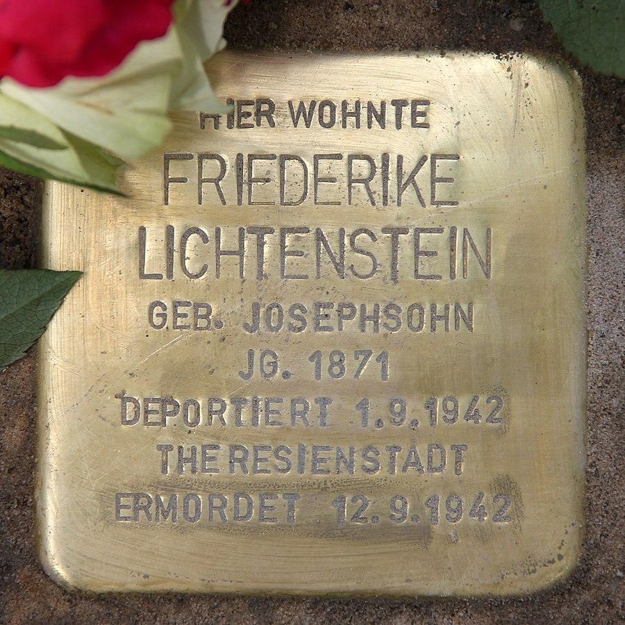 Friederike Lichtenstein wurde am 1. September 1942 mit dem 54. Alterstransport nach Theresienstadt deportiert und dort am 12. September 1942 ermordet.