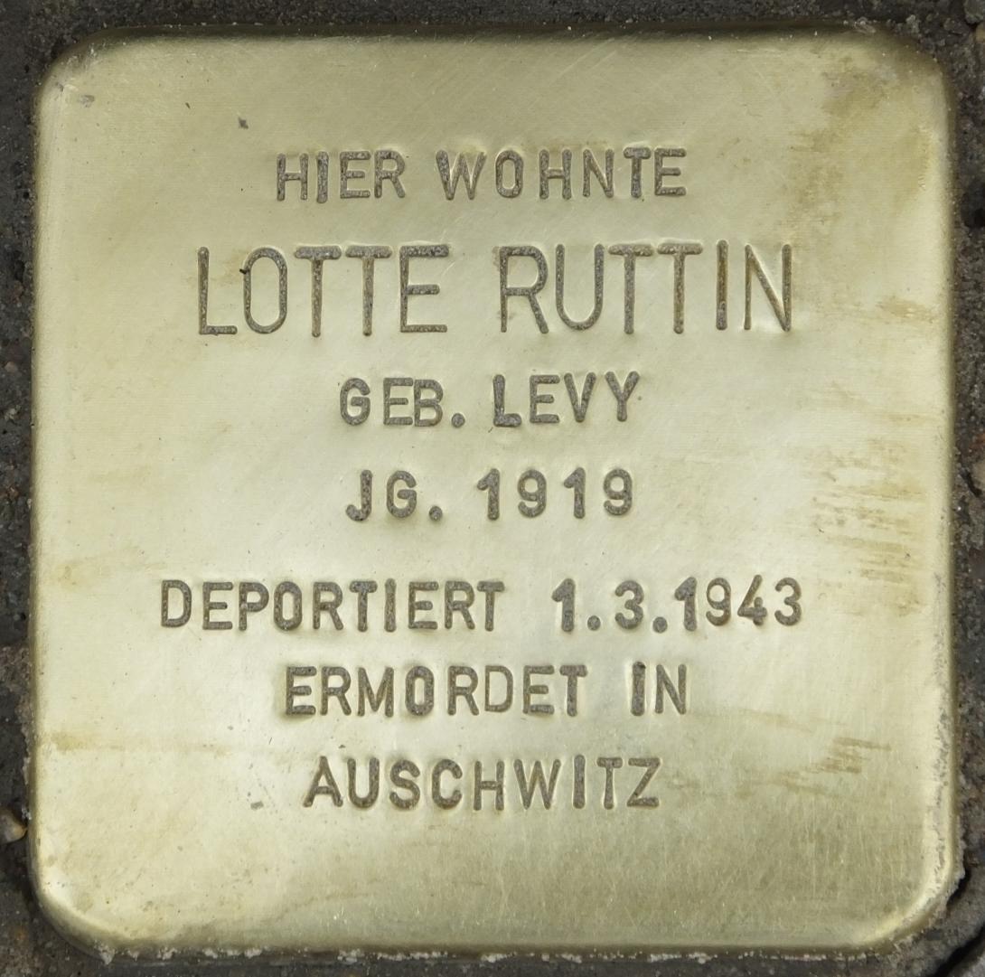 Lotte Ruttin, geb. Levy, wurde am 19. Dezember 1919 in Driesen in Brandenburg geboren. In der CentralVereins-Zeitung (CVZ), Blätter für Deutschtum und Judentum, am 9.6.1938 war Lotte Ruttin als Gesangsschülerin bei einem Konzert des Jüdischen Kulturbundes erwähnt.