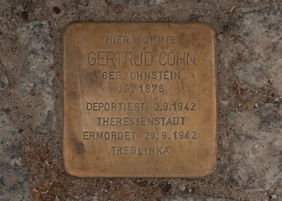 Am 2. September 1942 wurde Gertrud Cohn vom Gleis 17 des Bahnhofs Grunewald mit 100 Leidensgenossen nach Theresienstadt in der Tschechoslowakei deportiert. Bald danach wurde sie nach Minsk, Weißrussland, weitertransportiert und am 29. September dort ermordet.