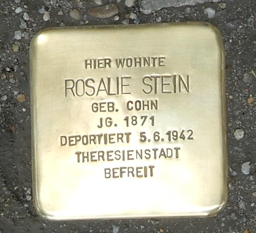 Rossalie Stein wurde am 26. Feburar 1871 als Rosalie Cohn in Pyritz, Kreis Stargard geboren. Sie heiratete Adolf Stein am 26. März 1899 und bekam mit ihm zwei Kinder, Luise und Erwin. Das erste Geschäft eröffneten sie in Pyritz, ehe sie in den Jahren 1911/12 nach Berlin-Siemensstadt zogen. Dort traten sie der jüdischen Gemeinde bei.