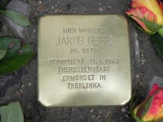 Am 11. September 1942 wurde Jakob Gehr vom Anhalter Bahnhof aus nach Theresienstadt deportiert. Zwei Waggons mit 100 Personen wurden an den "normalen" Zug gehängt. Es sollte niemand überleben: Jakob Gehr wurde am 29. Oktober 1942, wenig mehr als zwei Wochen später mit 2000 Anderen von Theresienstadt in das Vernichtungslager Treblinka verschleppt und dort ermordet.