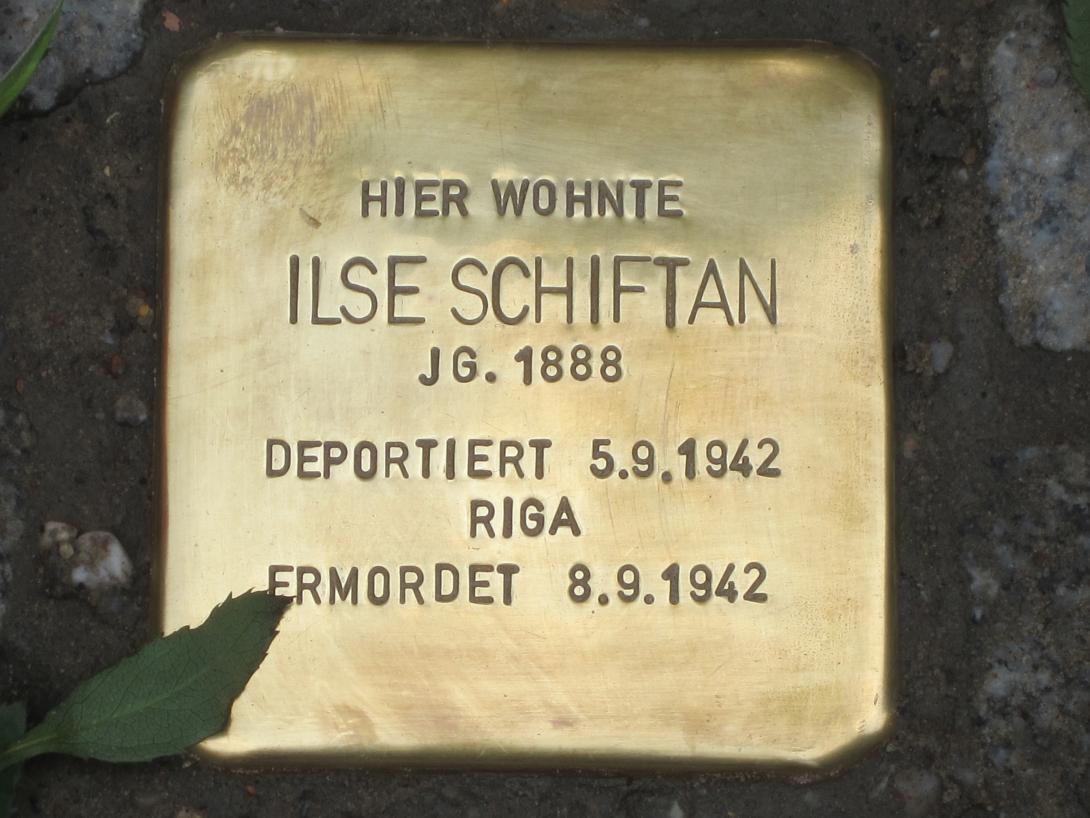 ihre Familien- und Besitzverhältnisse darlegen mussten, ausgefüllt hat, die Vermögenserklärung selbst ist jedoch nicht mehr erhalten. Zur Zeit der Volkszählung 1939 wohnte sie in der Nymphenburger Straße 4 in Berlin-Schöneberg zur Untermiete. Die Hauptmieterin Pauline Borchardt bewohnte dort als letzte jüdische Mieterin im Haus eine 6-Zimmer-Wohnung. Ende 1941 musste die 71-Jährige dort drei weitere Personen zur Untermiete aufnehmen: den 66-jährigen Wolf Felix Baum, seine 61-jährige Frau Martha und seine 62-jährige Schwester Hedwig Sass. Alle drei wurden bereits wenige Wochen später, am 19. Januar 1942, nach Riga deportiert. Ilse Schiftan, die kurz darauf mit ihrer Vermieterin Pauline Borchardt aus der Wohnung ausgewiesen worden sein muss, lebte zuletzt in Berlin-Wilmersdorf in der Konstanzer Str.11 in einem sogenannten Judenhaus. Von dort wurde die 54-Jährige am 5. September 1942 mit dem „19. Osttransport“ nach Riga deportiert und gleich nach Ankunft am 8. September erschossen. Ihre Vermieterin Pauline Borchardt starb am 8. Juli 1944 im