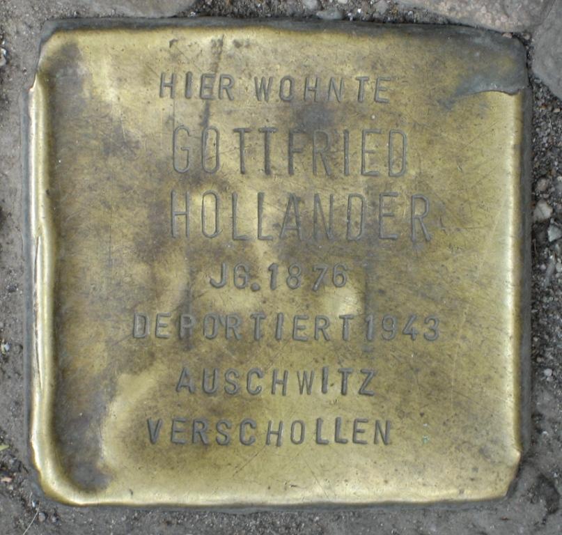 Dr. Gottfried Hollander wurde am 23. April 1876 in Wreschen/Posen (heute Września/Polen) geboren. Seine Ehefrau Lotty Hollander, geb. Guttmann wurde am 9. Oktober 1888 in Hildesheim in Hannover geboren. Seit 1919 bewohnte das Ehepaar eine 6-Zimmer-Wohnung in der Oranienburger Str. 3. Dr. Gottfried Hollander war promovierter Jurist und arbeitete als öffentlicher Notar und Rechtsbeistand. Als letzte Geschäftsadresse wird angegeben: An der Spandauer Brücke 3. Lotty Hollander wurde zur Zwangsarbeit bei der Firma Graetz in Berlin-Treptow in der Elsenstraße verpflichtet. Das Ehepaar Hollander wurde im Zuge der „Fabrik-Aktion“ deportiert. Gottfried Hollander wurde am 1. März 1943 mit dem „31. Osttransport“ nach Auschwitz verschleppt. Seine Frau Lotty Hollander wurde nur wenige Tage später, am 12. März 1943, mit dem „36. Osttransport“ ebenfalls nach Auschwitz deportiert. Die Eheleute gehörten bei der Befreiung des Lagers 1945 nicht zu den wenigen Überlebenden.