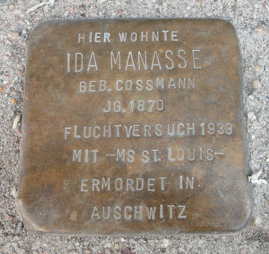 Ida Manasse geb. Cossmann, am 10. Dezember 1870 in Soldin, Herbert Manasse, geboren am 16. Oktober 1899 in Berlin, Emmy Manasse geb. Salomon, am 25. Mai 1904 in Berlin und Wolfgang Manasse, geboren am 14. März 1929 in Berlin, versuchten im Mai 1939 mit MS „St. Louis“ aus Deutschland zu fliehen, wurden aber weder in Kuba noch in den USA an Land gelassen. Das Schiff kehrte nach Europa zurück. Familie Manasse fand Aufnahme in Frankreich, wurde dort von der Gestapo ergriffen und am 7. Dezember 1943 vom Sammellager Drancy nach Auschwitz deportiert und ermordet.