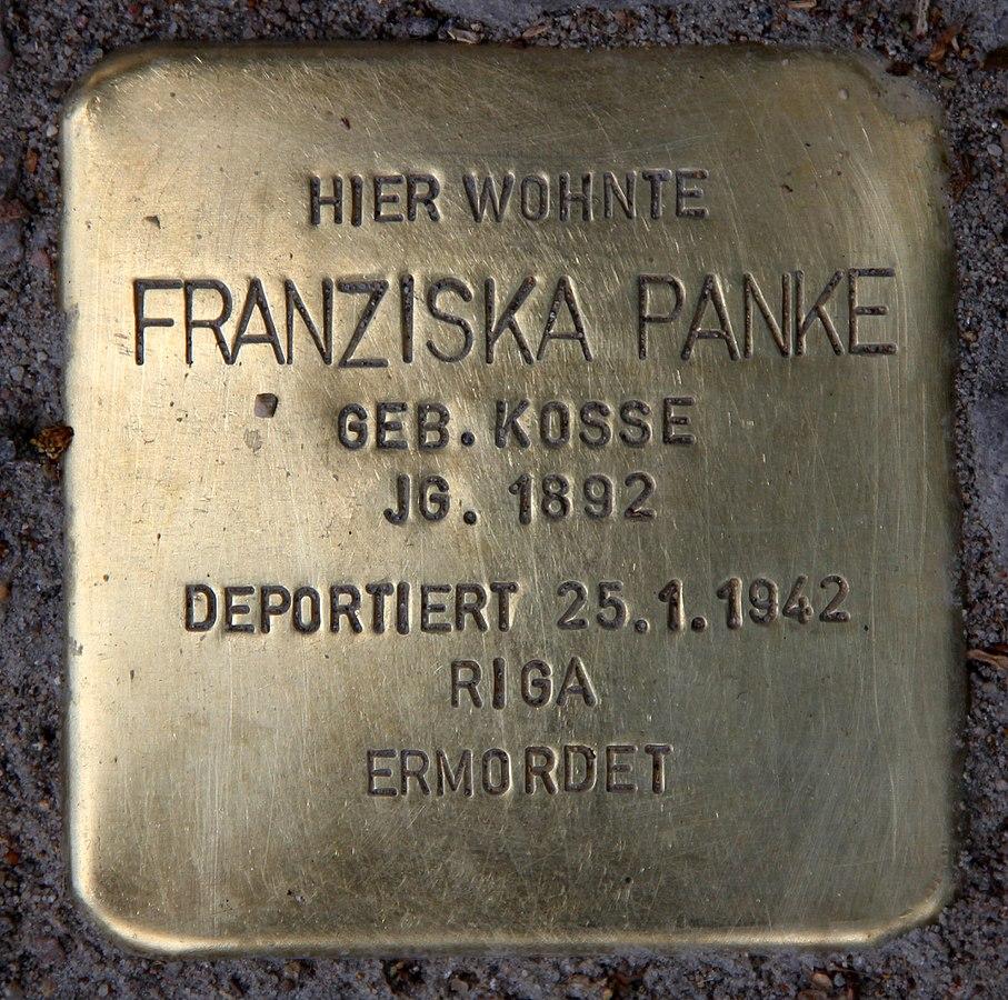 Franziska Panke lebte zum Zeitpunkt der Volkszählung vom 17. Mai 1939 in Berlin in der Pariser Straße 47 bei Sally und Martha Lewin und deren Enkeltochter Marion, die nach Auschwitz deportiert und dort ermordet wurden. Franziska musste sich in der von den Nationalsozialisten als „Sammellager" missbrauchten Synagoge in der Levetzowstraße7/8 im Stadtteil Moabit einfinden. Von dort wurde sie mit über 1000 jüdischen Berlinerinnen und Berlinern knapp 8 km durch die Stadt zum Güterbahnhof Grunewald getrieben und vom Gleis 17 mit dem sog. „10. Osttransport" am 25. Januar 1942 nach Riga deportiert. Da das Ghetto Riga damals schon geschlossen war, wurden fast alle mit diesem Zug Deportierten nach Ankunft auf dem Rigaer Vorortbahnhof Skirotava am 30. Januar 1942 in den Wäldern in der Umgebung erschossen.