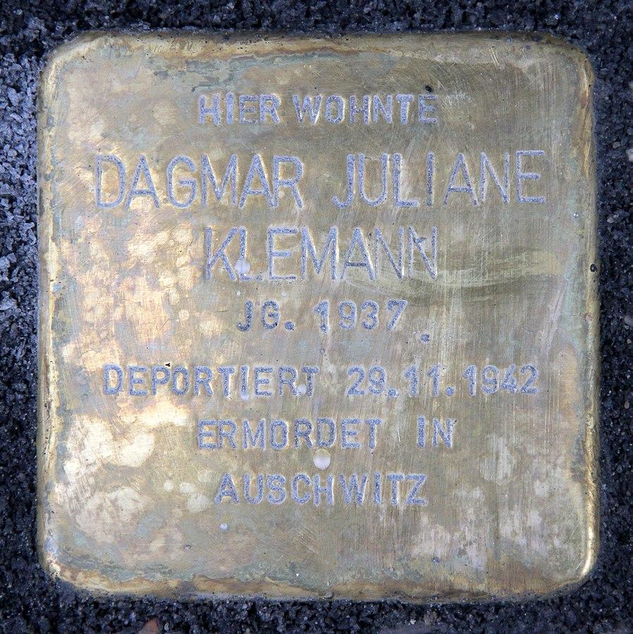 Dagmar Klemann kam am 31. Dezember 1937 als Tochter des Klempnermeisters und Schlossers Paul Walter Klemann und seiner Ehefrau Ursula Klemann in Berlin zur Welt. Ihre Mutter war zum Zeitpunkt ihrer Geburt erst 17 Jahre alt. Dagmars Vater war vor seiner Ehe mit Ursula bereits einmal verheiratet gewesen, seine Ehe mit Herta Hammer, die kinderlos blieb, wurde aber wieder geschieden. Am 19. Oktober 1942 holte man ihren Vater ab und deportierte ihn mit dem 21. Transport nach Riga. Sowohl die Namen des erst fünfjährigen Mädchens als auch der seiner Mutter erscheinen ebenfalls auf der Deportationsliste des 21. Transports. Aus Gründen, über die wir nur spekulieren können, sind beide Namen auf der Liste aber wieder ausgestrichen worden. Dagmars Mutter war zu diesem Zeitpunkt wieder schwanger. Möglicherweise war dies der Grund, weshalb man ihre