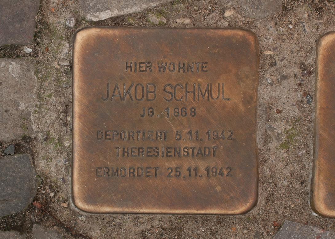 Jakob Schmul kam am 25. Februar 1868 in Hohensalza (Inowrazlaw, Region Posen/Poznan), zur Welt. Er machte eine Schneiderlehre – möglicherweise ein Traditionsberuf, da später in Berlin mehrere Schneider den Familiennamen Schmul führten. Ob und wie sie mit Jakob Schmul verwandt waren, wissen wir nicht. Jakob heiratete die aus dem nahegelegenen Schubin (Szubin) stammende Anna Schaul. In Schubin war Anna am 17. Oktober 1874 geboren worden. Das Ehepaar blieb wahrscheinlich zunächst in Posen, da Jakob Schmul im Berliner Adressbuch erst 1924 verzeichnet ist. Da hatte er sich als Schneider in der Charlottenburger Wallstraße 91 (heute Zillestraße 27) niedergelassen. Vielleicht haben beide schon früher zur Untermiete in Berlin gewohnt. Die Wallstraße wurde 1933 nach dem in einer Straßenschlacht zwischen Kommunisten und Nationalsozialisten umgekommenen SS-Mann Hans Maikowski umbenannt und dabei veränderte man die Hufeisennummerierung in wechselseitige Hausnummerierung, sodass Jakob Schmuls Adresse nun Maikowskistraße 27 lautete.