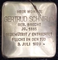 Gertrud Schnirlin geb. Brecht wurde am 23.7.1885 in Lübeck geboren. Sie war die Tochter von Ernst Walther Brecht und Marie Brecht geb. Weishaupt. Gertrud war die jüngere Schwester von Arnold Brecht (bis 1933 Vertreter des Landes Preußen im Reichsrat), der 1939 noch vergeblich versuchte das Paar nach Amerika in Sicherheit zu bringen.