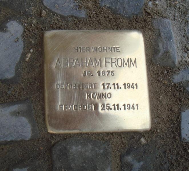 Am 15. November 1941 mussten Abraham und Johanna Fromm sich zusammen mit über 1000 weiteren Berliner Jüdinnen und Juden in der ehemaligen Synagoge an der Levetzowstraße in Berlin-Tiergarten einfinden. Von dort wurden sie zum Bahnhof Berlin-Grunewald geführt und am 17. November 1941 mit dem „VI. Transport“ in das Ghetto Kowno (Kaunas) im heutigen Litauen deportiert. Alle 1006 Menschen aus diesem Zug wurden am 25. November 1941 im Fort IX von Kowno ermordet.