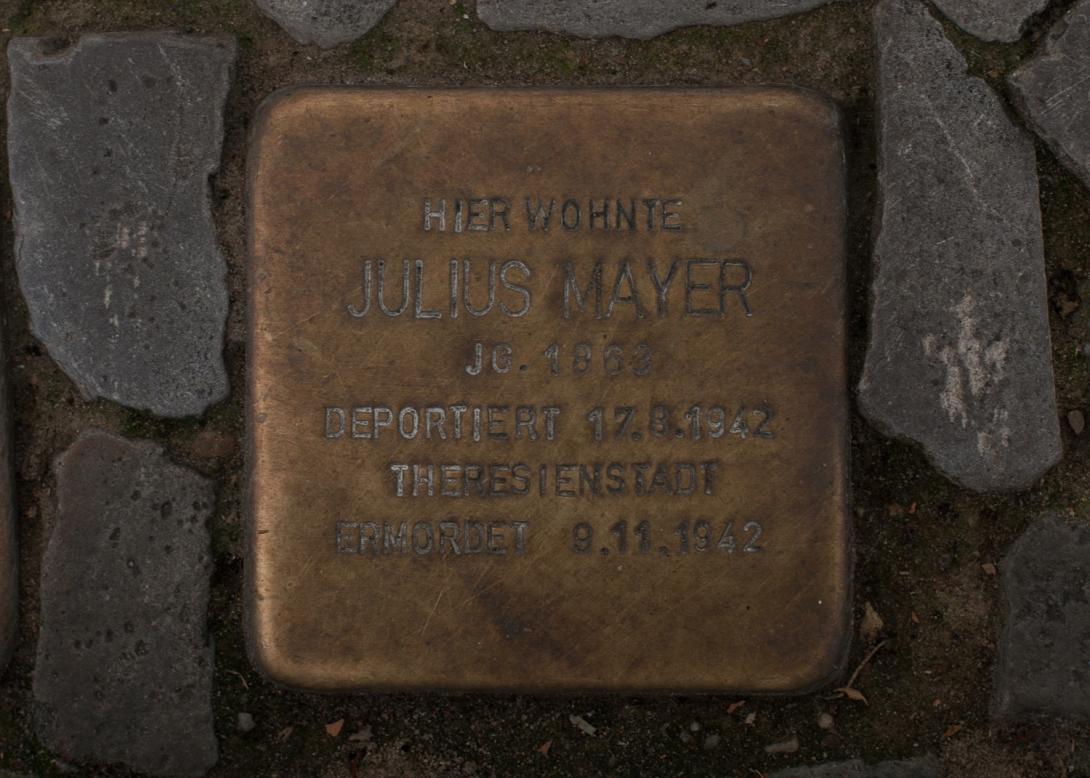 Julius Mayer war Besitzer der Julmay Bank in Berlin. Als die Nazis den Juden eigene Geschäfte verboten, wurde er enteignet und die Bank von einem Deutschen übernommen. Am 17. August 1942 wurden Julius und Pauline Mayer im Alter von 79 und 66 Jahren mit dem ersten großen Theresienstadt-Transport in das Ghetto nördlich von Prag deportiert. In dem Personenzug, der vom Güterbahnhof Moabit startete, saßen 997 Menschen. Von ihnen überlebten nur 16. Das Todesdatum von Pauline Mayer war der 19. Oktober 1942, Julius Mayer ist am 9. November 1942 ums Leben gebracht worden.