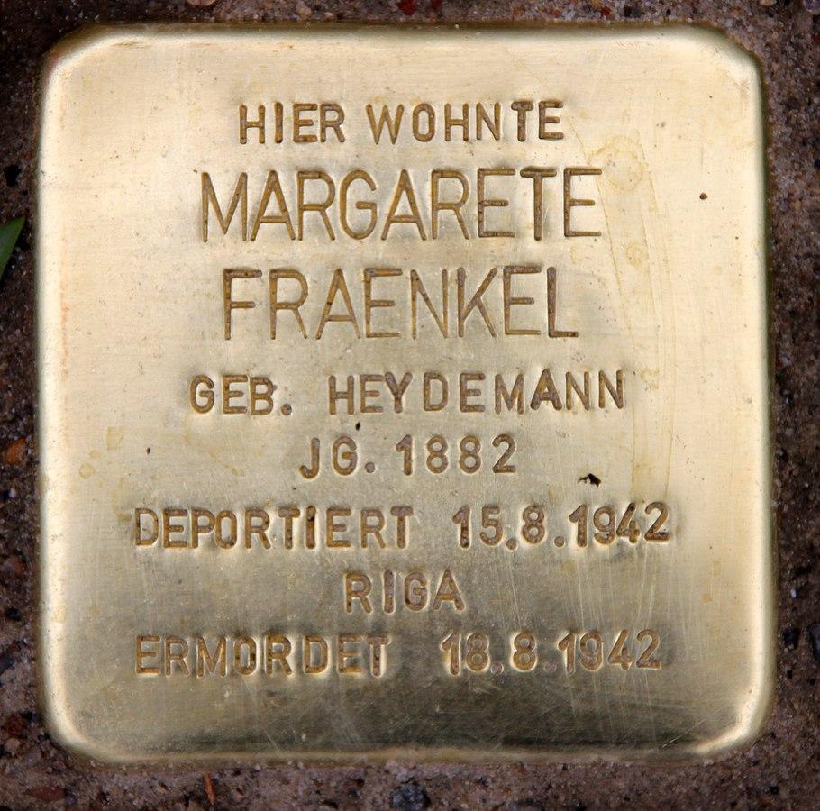 Margarete Fraenkel ist am 1. April 1882 in Posen (heute: Poznań / Polen) als Tochter von Theodor Heydemann und Regine Placzek geboren. Sie stammte aus einer eher wohlhabenden Familie, seit vier Generationen Kaufleute.