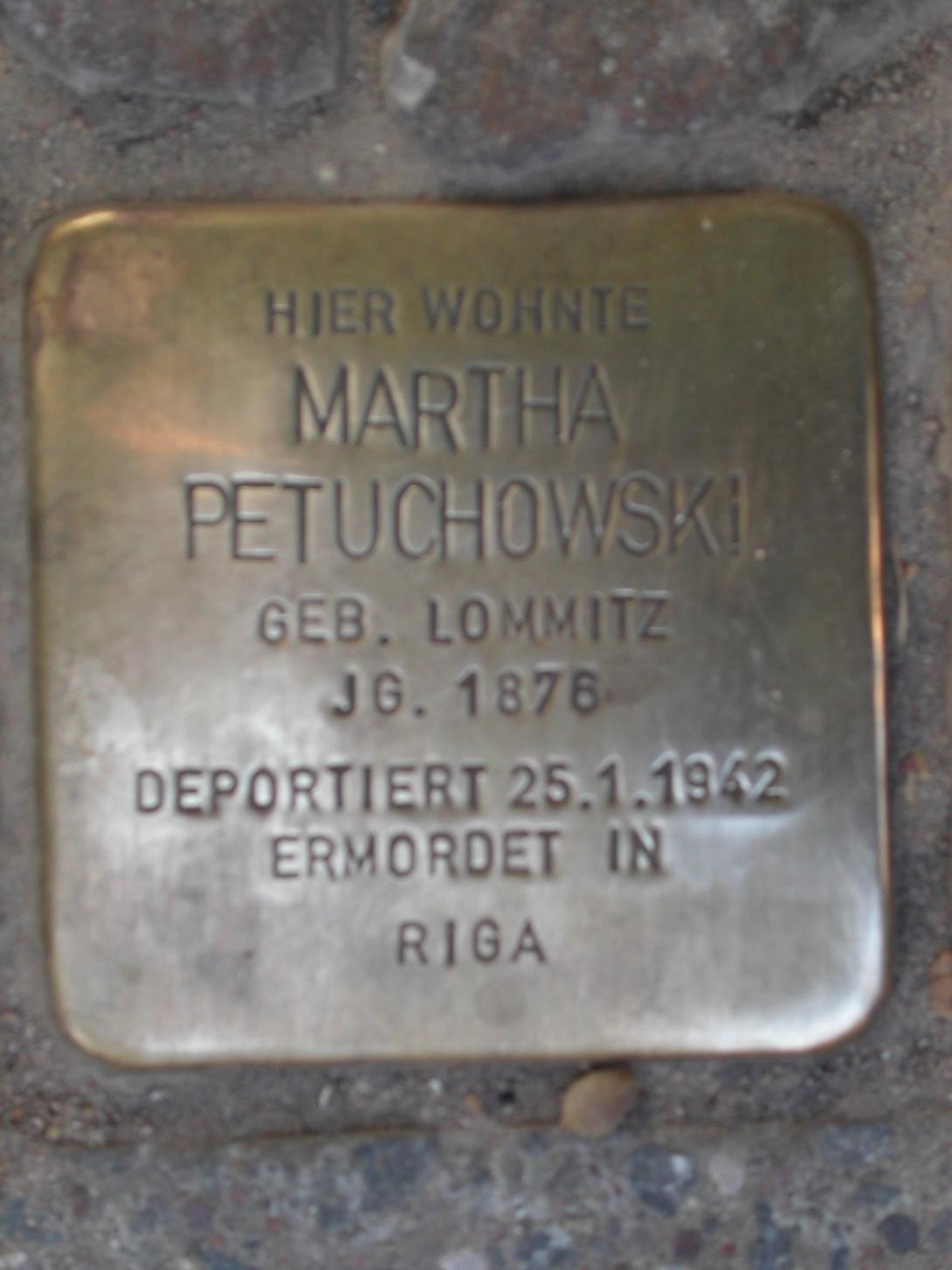 Martha Petuchowski, geb. Lommitz, wurde am 16. Juli 1876 in Breslau/Wrocław geboren. Sie war verheiratet mit dem Kaufmann Bernhard Petuchowski, der am 21. Januar 1870 in Wilna geboren wurde und vermutlich Ende 1938 oder 1939 starb. Ihm stand eine bescheidene Rente zu, von der seine Witwe lebte. Martha Petuchowski blieb in der Wohnung in der Regensburger Str. 16, wo das Ehepaar seit 1933 gewohnt hatte. Sie wohnte im Seitenflügel, parterre rechts, in einer 3-Zimmer-Wohnung mit Küche und Bad. Ihr Restvermögen nach der