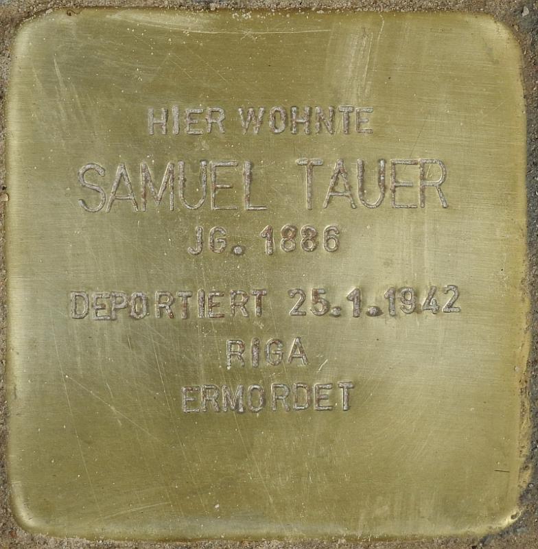 Samuel Tauer wurde am 14. Juni 1886 in Krementschug (heute in der Ukraine) geboren. Er war Diplom-Ingenieur und verheiratet mit Marie Rosenkranz, geboren am 28. November 1890. Sie verstarb am 20. November 1931 und wurde am 23. November 1931 auf dem Jüdischen Friedhof Weißensee beigesetzt. Das Ehepaar wohnte in der Weimarischen Str. 28 in Wilmersdorf. Nach Meldeunterlagen ist Samuel Tauer nach dem Tod seiner Frau noch in die Livländische Straße 9a gezogen, die in der gleichen Gegend in Wilmersdorf lag, bevor er später in die Regensburger Str. 10 zog.