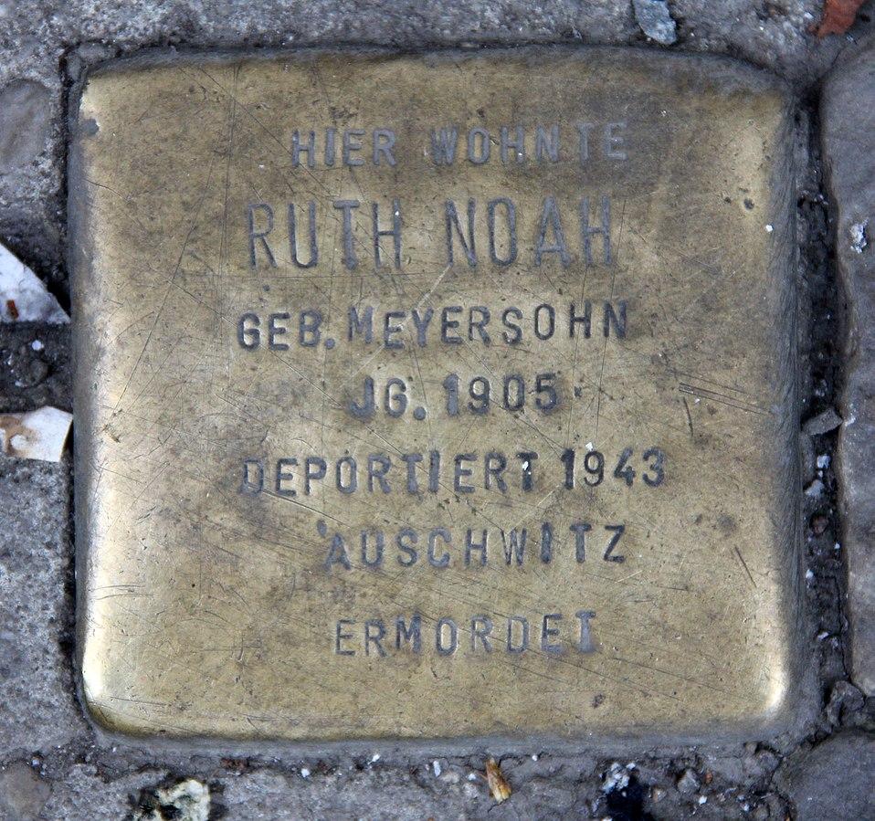Ruth Noah, geb. Meyersohn, wurde am 24. April 1905 in Hohensalza/Posen (heute Inowrocław) geboren. Sie lebte zusammen mit ihrem Mann Walter Noah, der kleinen Tochter Tana und den Schwiegereltern Samuel und Frieda Noah in der Rosenthaler Str. 42 in Berlin-Mitte. Am 3. März 1943 wurde Ruth Noah zusammen mit ihrem Mann und der dreijährigen Tana mit dem „33. Osttransport“ nach