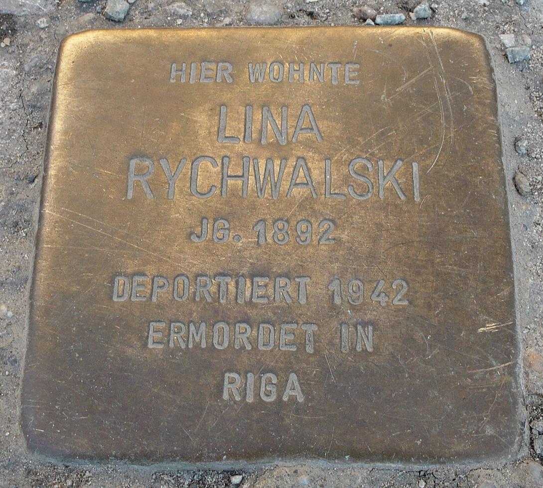 Sie war in dem Personenzug, der mit 1034 jüdischen Männern, Frauen und Kindern am 13. Januar 1942 den Bahnhof Berlin-Grunewald mit dem Ziel Riga verließ. Aus diesem „8. Osttransport“ haben 15 Menschen überlebt – Lina Rychwalski war nicht unter ihnen.