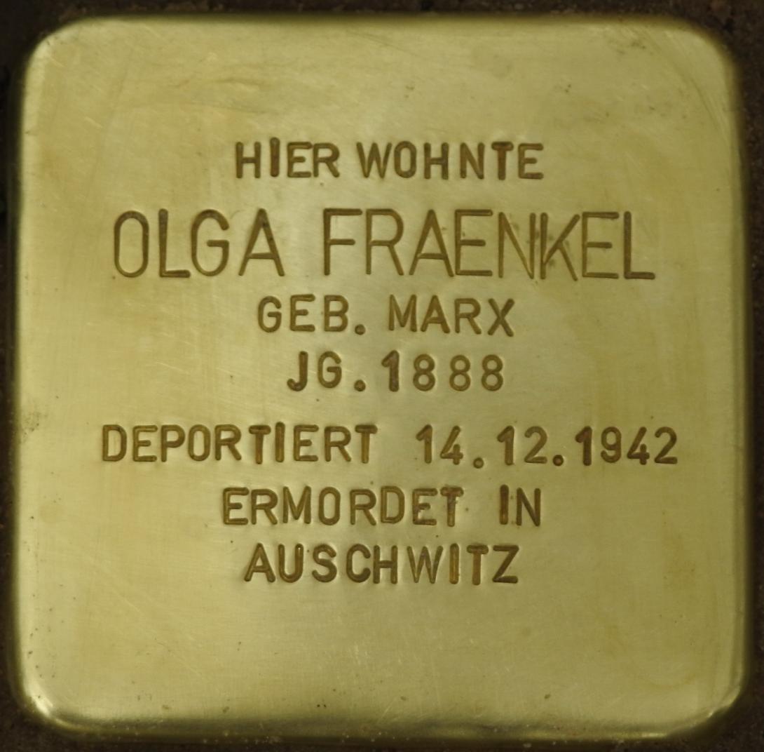 Nachdem Edith am 8. Juli 1942 verhaftet worden war, hat Olga Fraenkel ihre Tochter am 8. Oktober 1942 noch ein letztes Mal im Gerichtsgefängnis in der Kantstraße sehen dürfen. Am 14. Dezember 1942 wurde Olga Fraenkel deportiert – mit dem „25. Osttransport“ nach Auschwitz . Ihr Todesdatum ist nicht bekannt.