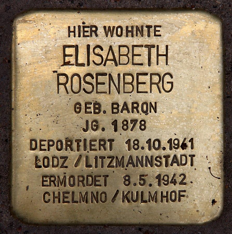 Am 18. Oktober 1941 ist Elisabeth Rosenberg aus ihrer Wohnung in der Schaperstraße 22 über das Sammellager Levetzowstraße 7-8, einer hierfür missbrauchten Synagoge, nach Lodz/Litzmannstadt deportiert worden. Es war der erste Deportationszug, der das berüchtigte Gleis 17 des Berliner Bahnhofs Grunewald verließ. Darin saßen 1013 Menschen. Ursprünglich wurde das Todesdatum von Elisabeth Rosenberg auf den 31. Dezember 1942 festgesetzt, als Ort wurde Kulmhof (Chelmno) genannt, wohin sie am 8. Mai 1943 von Theresienstadt weiterdeportiert worden sein soll. Die Brüder Erwin und Lotar erklärten jedoch 1960 eidesstattlich, dass sie in der Mitte des Jahres 1943 eine Nachricht ihrer Mutter erhalten hätten, und zwar eine Vordruckkarte vom Roten Kreuz, abgesendet aus Litzmannstadt. Auch die Tochter Irma Graf erklärte, dass sie Pfingsten 1943 eine Nachricht ihrer Mutter mit deren eigenhändiger Unterschrift gesehen habe. Weiter wurde in einer fotokopierten eidesstattlichen Erklärung dokumentiert, dass zwei andere Jüdinnen sie nach 1942 noch in anderen Lagern gesehen haben. Sie soll 1945 krank in dem Lager Salzwedel zurückgeblieben und möglicherweise später an einem anderen Ort umgekommen sein. Nachfragen in Salzwedel und im Stammlager Neuengamme ergaben aber keine Hinweise. Im Gedenkbuch des Bundesarchivs für die Opfer des Nationalsozialismus sind Todesdatum und -ort am 8. Mai 1942 im Vernichtungslager Chelmno ausgewiesen.