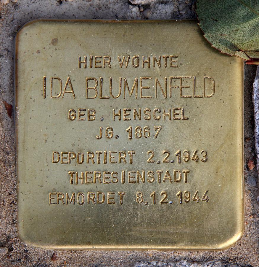 Ida Blumenfeld geb. Henschel ist am 8. Dezember 1867 in Sommerfeld bei Kremmen im Norden Brandenburgs geboren, nach Angaben eines Nachkommen am 10. Dezember. Sie war die Tochter von Isadore und Henriette (Jette) geb. Troplowitz. Über ihr Leben und ihren Beruf ist wenig bekannt. Sie wohnte mit ihren drei Kindern und mit ihrem Mann Heinrich Blumenfeld, von dem ebenfalls nur wenig bekannt ist, außer dass er Kaufmann war, in Berlin am Nürnberger Platz 4 (heute: Eckhaus Nürnberger Straße 33-34 / Schaperstraße 1) in Charlottenburg, 1931 am Planufer 59 in Kreuzberg, dann in der Berchtesgadener Straße 8 in Schöneberg. Zuletzt war sie im jüdischen Krankenhaus Auguststraße 14-15 im Stadtbezirk Mitte.