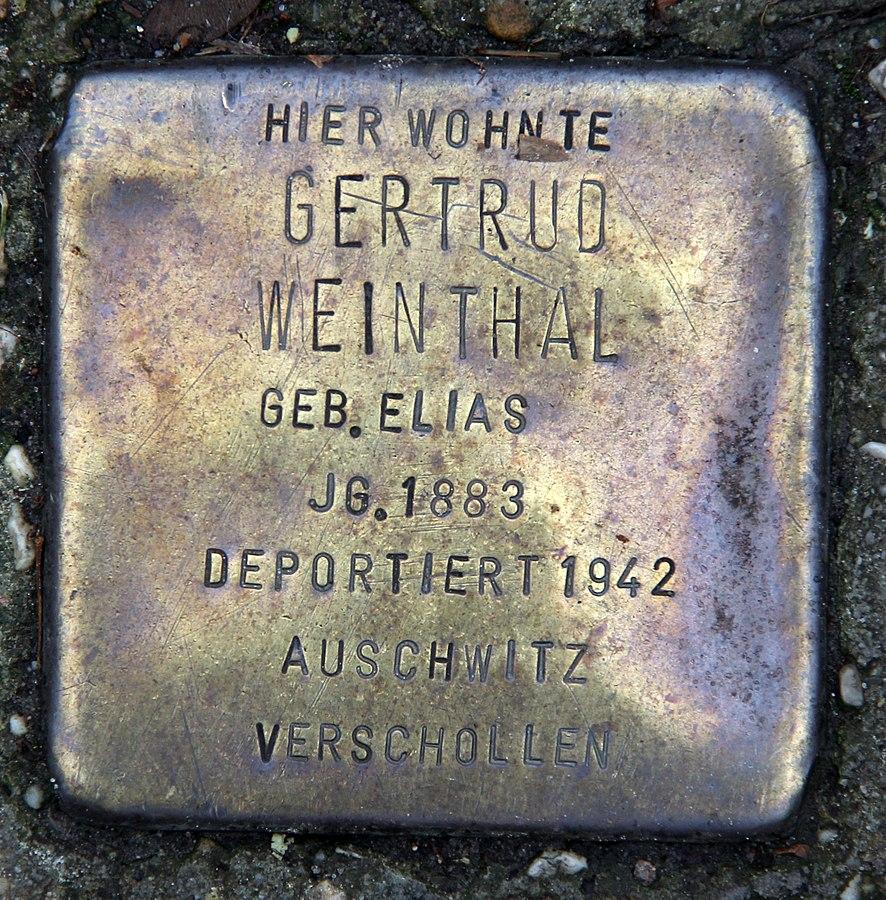 Gertrud Weinthal, geb. Elias, wurde am 26. November 1883 in Hamburg geboren. Sie heiratete den Kaufmann Isidor Weinthal aus Esens/Ostfriesland, wo das Ehepaar vermutlich bis in die 1930er Jahre hinein lebte. Mit 43 Jahren brachte sie am 1927 in Esens die gemeinsame Tochter Frieda zur Welt.