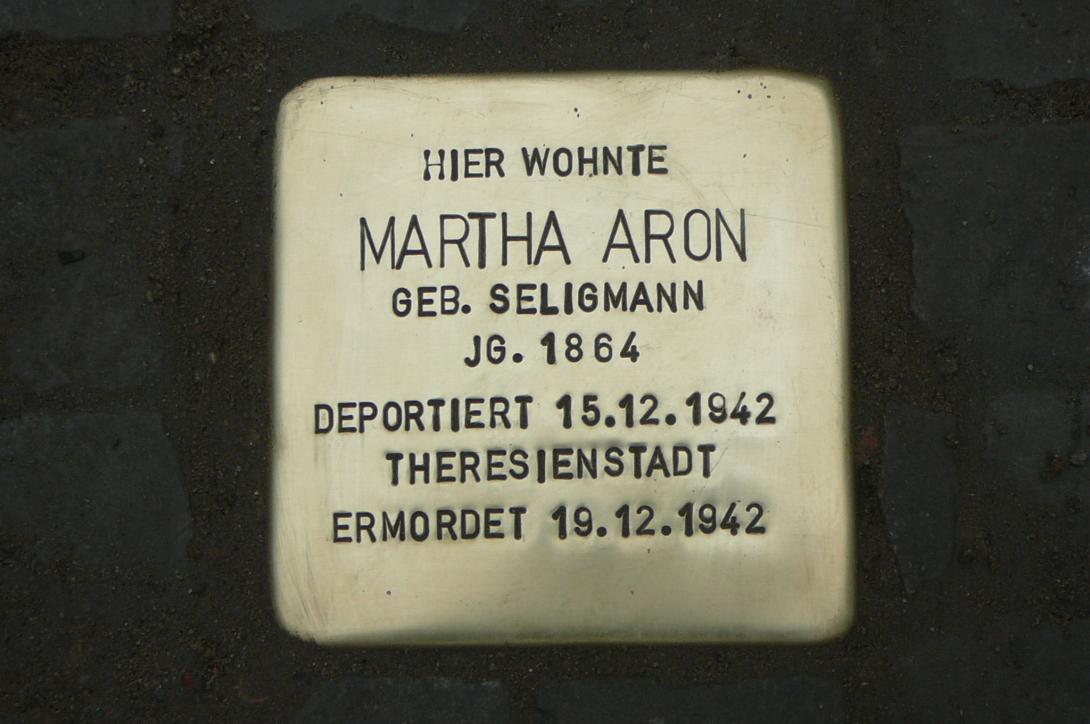 Am 15. Dezember 1942 wurde Martha Aron in einem Transport von 100 überwiegend älteren Menschen vom Anhalter Bahnhof ins knapp 300 Kilometer entfernte Theresienstadt gebracht. Der Waggon, in den die 78-jährige Frau getrieben wurde, die nur wenige Kleidungsstücke und Gegenstände in einem Koffer oder Rucksack mitnehmen durfte, war an den fahrplanmäßigen Zug Berlin-Dresden-Prag angehängt. Am 19. Dezember 1942 ist sie an den unertragbaren Folgen des Transports und der ersten Tage in dem Ghetto ums Leben gekommen. Insgesamt sind etwa 15 000 Jüdinnen und Juden in116 Zügen aus Berlin nach Theresienstadt deportiert worden.