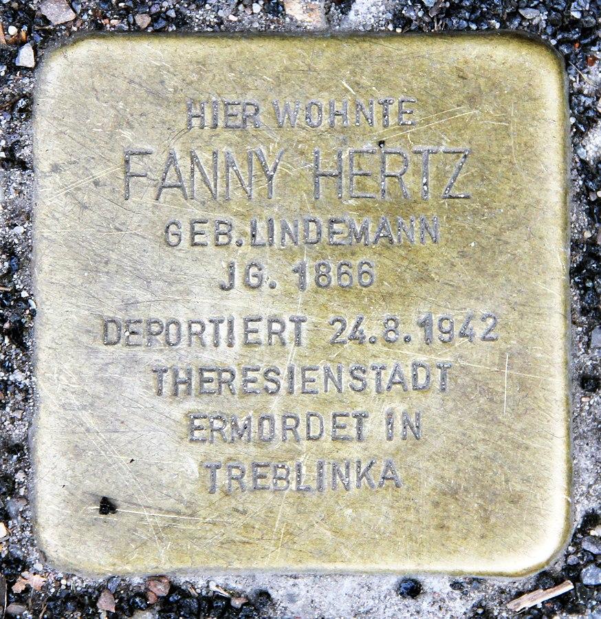 Am 24. August 1942 wurde Fanny Hertz mit dem 48. Alterstransport nach Theresienstadt verschleppt, wie die meisten der Bewohnerinnen und Bewohner dieses Hauses und der jüdischen Altersheime in Berlin insgesamt.