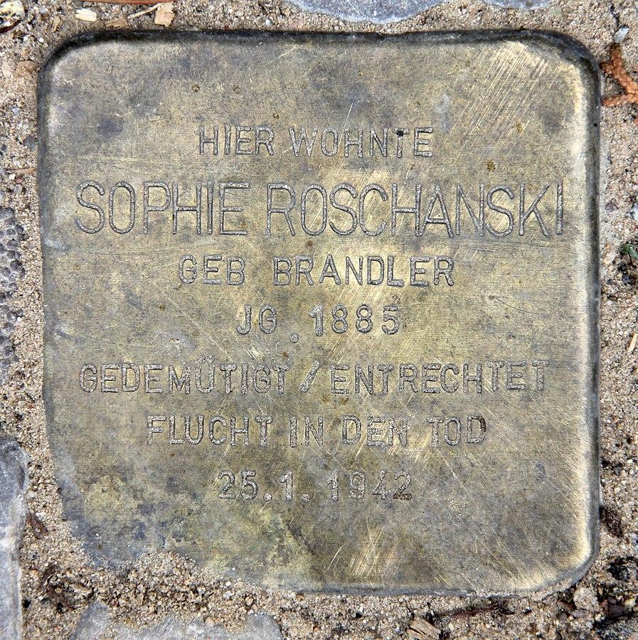Sophie Roschanski, geb. Brandler war die Tochter von Samson und Rosa Brandler, geb. Korner, und wurde am 20. November 1885 in Warschau geboren. Sie studierte am Seminar und war staatlich geprüfte Sprachlehrerin. In Warschau hat sie den Dipl. Ing. David Roschanski geheiratet. Über ihn gibt es keinen weiteren Hinweis, weder ein Geburts- noch ein Todesdatum. Sophie Roschanski, im Berliner Melderegister der Volkszählung vom 17.5.1939 in der Seesener Straße 50 und als „staatenlos“ eingetragen, war Witwe und hat vom 19. September 1941 bis zum Tag ihres Selbstmordes am 25. Januar 1942 den gelben