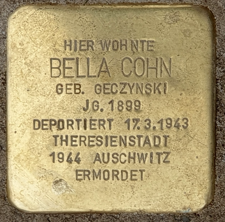 Bella und Justus Cohn wurden am 17. März 1943 mit dem 4. großen Alterstransport nach Theresienstadt und von dort am 19. Oktober 1944 nach Auschwitz deportiert. Bella Cohn wurde wahrscheinlich sofort nach der Ankunft ermordet. Ihr Ehemann wurde am 27. Oktober von Auschwitz nach Kaufering, einem Außenlager des KZ Dachau , verschleppt. Justus Cohn kam am 15. März 1945 in Dachau ums Leben.