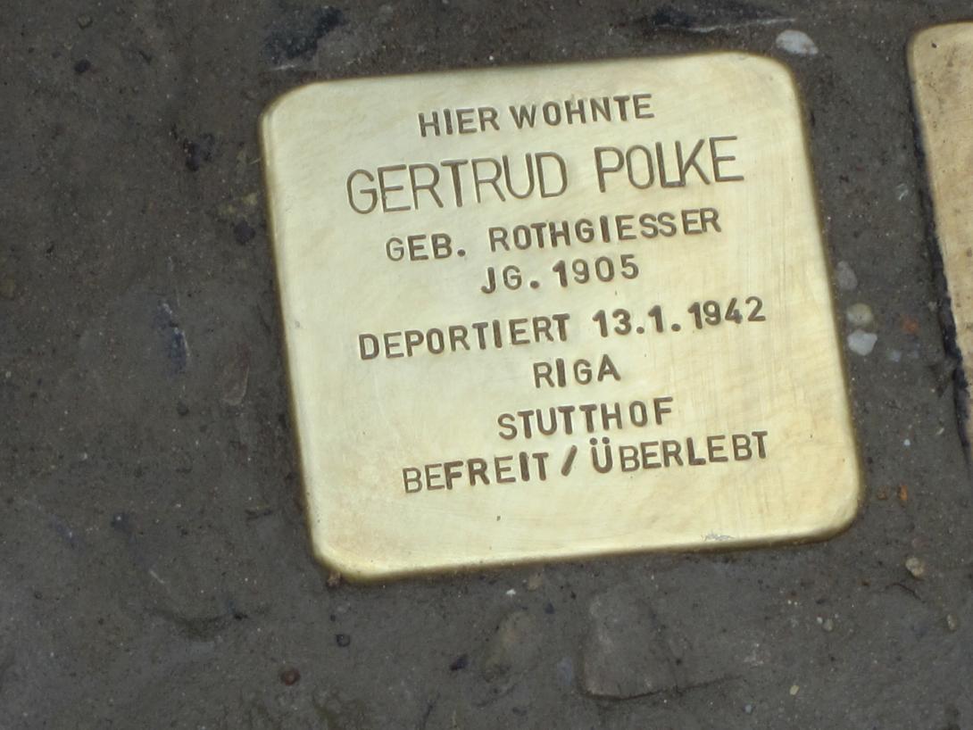 Der 8. Deportationszug brachte Gertrud und Herbert Polke zusammen mit 1.035 weiteren Personen am 13. Januar 1942 nach Riga. Am 16. Januar 1942 kamen sie auf dem Güterbahnhof Skirotawa an. In eisiger Kälte legten sie ihren Fußmarsch in das Ghetto fort. Im Lager Kaiserwald bei Riga wurden die noch Arbeitsfähigen zur Arbeit verpflichtet. Dort fand Herbert Polke im Dezember 1943 den Tod. Gertrud Polke überlebte als eine von 15 der ehemals 1.035 deportierten Menschen. Sie war nach der Schließung des Rigaer Ghettos im November 1943 in das KZ Riga-Kaiserwald und von dort in das Arbeitslager Riga-Spilve gebracht worden. Im Mai 1944 wurde sie in ein Außenlager des KZs Kauen in Litauen deportiert und nach dessen Auflösung weiter nach Stutthof. Hier arbeitete sie im Arbeitslager Steinort-Elbing. Im Herbst 1944 wurde Gertrud Polke in das Lager Feuerstein (Krzemieniewo) in Polen transportiert. Im Januar 1945 trat sie nach der Flucht der Wachmannschaft von dort alleine die Rückkehr nach Berlin an. Am 23. September 1945 war sie nach einem halbjährigen Fußmarsch durch Polen wieder in Berlin. An ihre großen beruflichen Erfolge konnte sie nach dem Krieg nicht mehr anknüpfen. 1948 erhielt sie eine Knochenplastik am linken Unterarm. Am linken Unterschenkel, aus dem der Knochenspan entnommen wurde, entstand eine Fraktur, die aufgrund der jahrelangen Unterernährung nicht mehr heilte. Sie konnte zwar ihre Entschädigungsansprüche weitgehend durchsetzen, der bürgerliche Wohlstand war aber für immer verloren. Im Jahre 1946 stellte Gertrud Polke einen Antrag auf „Wiedereinräumung der hälftigen Beteiligung“ an dem Kino „Astor“. Der ehemalige Teilhaber verweigerte diese jedoch und überwies Gertrud Polke lediglich kleine monatliche Geldbeträge. Am 16. April 1947 wurde die Klage abgewiesen, da Gertrud Polke keine dokumentarischen Beweise für die Beteiligung ihres Mannes an dem Kino vorzulegen in der Lage war. Sie erhielt lediglich 14.000,-- DM als Entschädigung, das Miteigentum an dem Kino konnte sie aber nicht beweisen. Schließlich erhielt sie noch weitere 4.000,-- DM Entschädigung vom Land Berlin. Ihre am 1. April 1960 gestellten Ansprüche auf Wiedergutmachung wegen abhanden gekommener Schmuckstücke und Tafelsilber wurden schließlich mit 13.500,-- DM abgegolten. Die Geltendmachung von Ansprüchen für den Schmuck ihres Mannes konnte sie hingegen nicht durchsetzen. Sie erhielt in einem Vergleich lediglich 1.500,-- DM. Im Januar 1953 erhielt sie 6.090,-- DM für den erlittenen Freiheitsentzug. Ein weiterer Rechtsstreit befasste sich mit den Möbeln von Gertrud Polke. Ihre Eltern hatten bereits 1933 auf Herausgabe der Möbel gegen ihre Tochter geklagt. Die Eltern hatten ihr diese anlässlich ihrer ersten Hochzeit als Aussteuer zugedacht. Aufgrund des „unsittlichen Lebenswandels“ ihrer Tochter wollte man ihr den Anspruch auf eine Aussteuer nachträglich entziehen. Am 12. April 1934 wurde ihr ehewidriges Verhalten in einem Urteil bestätigt. Am 12. August 1942 wurde die Wohnung der Polkes aufgelöst und die Einrichtungsgegenstände den Eltern übergeben. Gertrud Polke erhielt aber weitere 5.000,-- DM, da die Möbel, die sich noch in der Güntzelstraße 7-8 befunden hatten, „mit an Sicherheit grenzender Wahrscheinlichkeit verschleudert“ worden waren. Gertrud Polke starb am 3. Juni 1984. Ihr Grab befindet sich auf dem Jüdischen Friedhof Heerstraße, Block N1, Reihe 5. Ihr Grabstein mit Davidsstern und hebräischen Schriftzeichen trägt die Aufschrift „Meine liebe Gertrud Polke 1905-1984“.