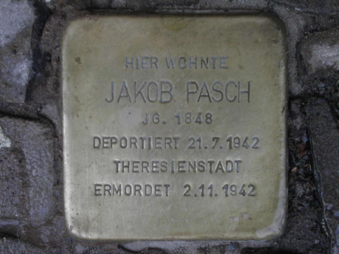 Jacob Pasch, der mit seiner Tochter Margarethe und deren Mann Leopold zusammenlebte, stammte aus Rawitsch in der Nähe von Posen. Im Alter von 94 Jahren musste er die Deportationen seiner Tochter, seines Schwiegersohns und anderer Bewohner des Hauses Sybelstraße 39 miterleben, er selbst wurde zunächst in ein Altersheim an der Grabenstraße 12 in Lichterfelde gebracht. Von dort transportierten ihn die Nazis am 21. Juli 1942 vom Anhalter Bahnhof in einem Personenzug mit 100 weiteren überwiegend alten Menschen nach Theresienstadt ab, wo er am 2. November im völlig überfüllten