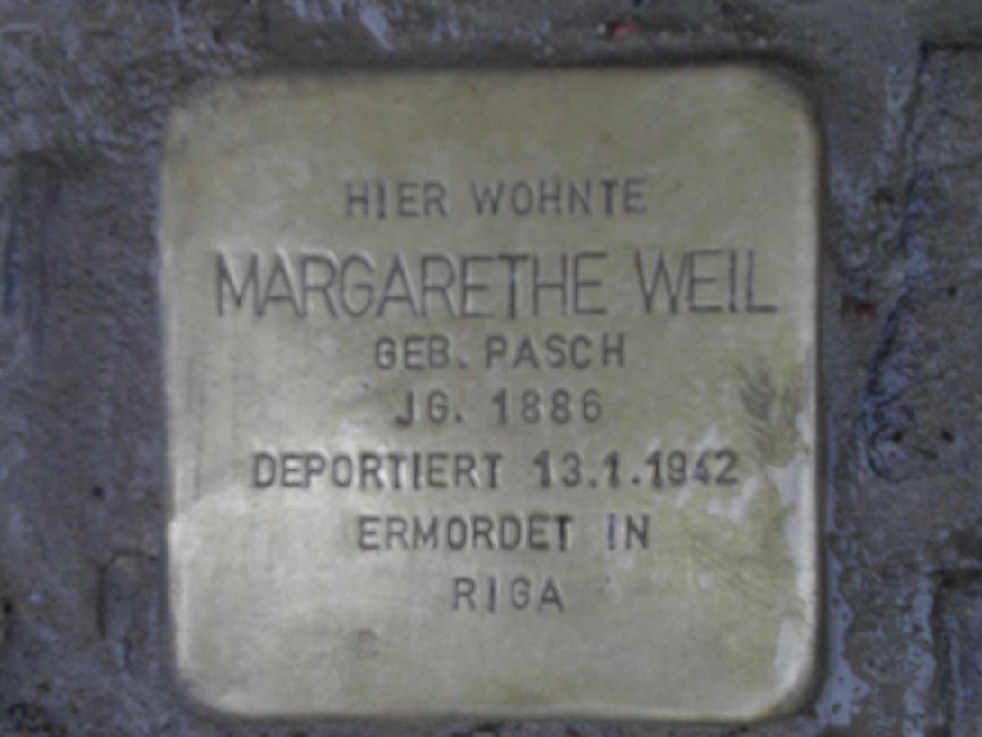 Am 13. Januar 1942 wurden Leopold und Margarete Weil zusammen mit ihrer Untermieterin Hertha Tockus und drei anderen in der Etage darüber lebenden Menschen (Wolf und Slata Lewin sowie Siegfried Herrrmann) über das Sammellager in der ehemaligen Synagoge an der Levetzowstraße vom Bahnhof Grunewald aus nach Riga deportiert, wo sie wahrscheinlich – wie fast alle der überwiegend alten und kranken 1042 Zuginsassen – sofort nach der Ankunft am 16. Januar 1942 erschossen worden sind. Von ihrem uralten Vater Jacob Pasch mussten sie sich verabschieden.