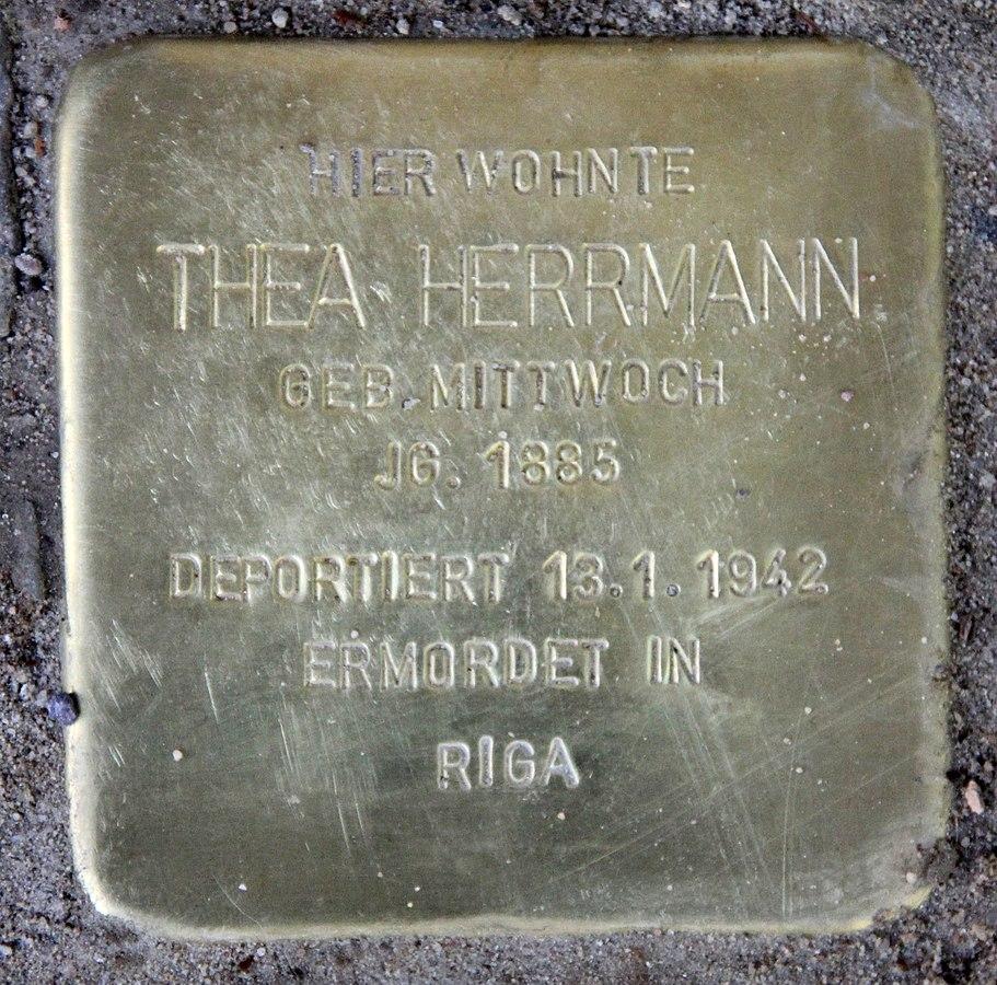Siegfried und Thea Herrmann waren Untermieter bei Wolf und Słata Lewin im 4. Stock links. Siegfried Herrmann ist am 6. Mai 1877 auf dem Gut Augken (Ostpreußen) geboren, Thea Hermann, geb. Mittwoch, am 12. Juli 1885 in Schrimm (Šrem, Polen). Sie sind am 13. Januar 1942 zusammen mit ihren Vermietern Lewin, den darunter wohnenden Weils und deren Untermieterin Hertha Tockus vom Bahnhof Grunewald in einem mit 1034 Menschen voll besetzten, trotz des harten Winters unbeheizten Zug in die lettische Hauptstadt Riga deportiert worden, wo er am 16. Januar auf dem Bahnhof Skirotava ankam. Fast alle wurden im Wald von Rumbula in der Nähe ermordet. Nur 15 überlebten diesen Transport nach dem Zweiten Weltkrieg.
