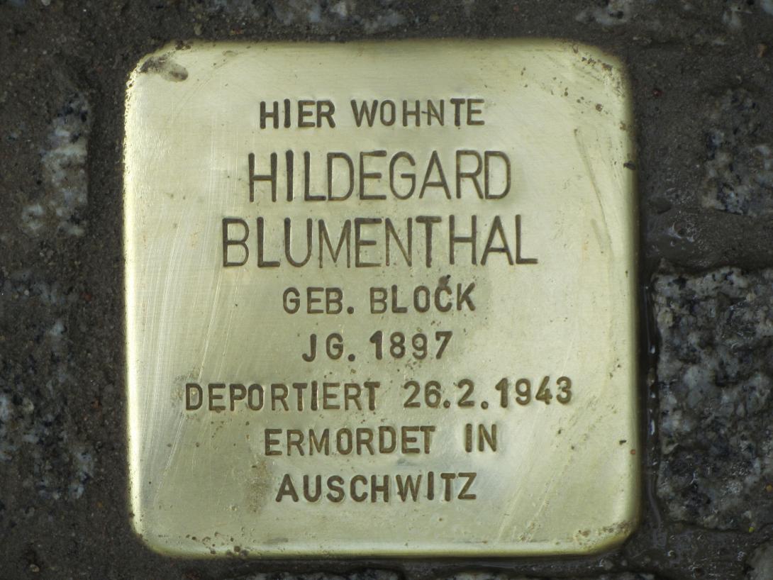 Am 26. Februar 1943 wurde Hildegard Blumenthal in einem Zug zusammen mit 913 Menschen vom Bahnhof Grunewald nach Auschwitz deportiert und dort ermordet.