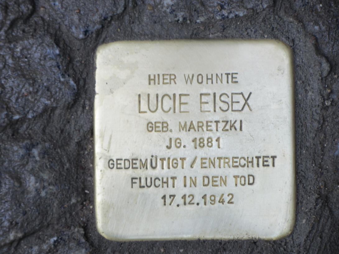 Der Geheimen Staatspolizei ( Gestapo ) war Lucie Eisex als Kommunistin bekannt. Im Dezember 1942 sollte sie deportiert werden. Diesem Schicksal entzog sie sich: Am 17. Dezember 1942 wurde sie tot in ihrer Wohnung aufgefunden.